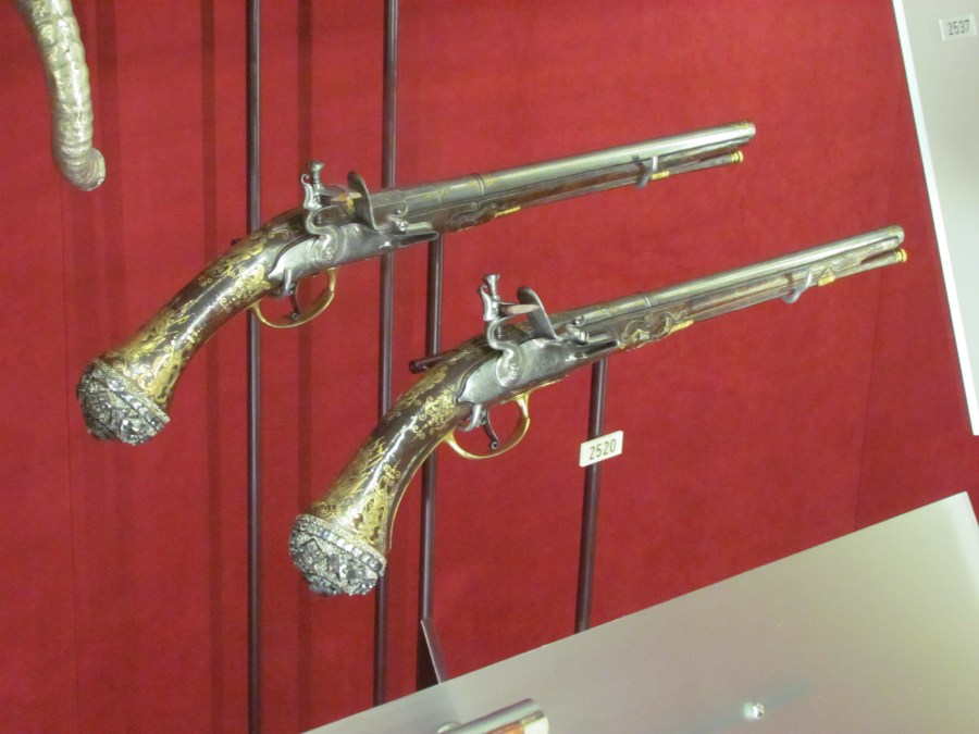 In the basement were the gifts that were displayed by the king for his guests. These items were beautifully displayed and were works of art on their own. This is a pair of pistols with diamond studded handles.