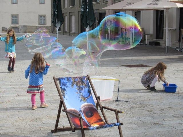 Right down the street from our boat, right on the edge of the river, a small farmers’ market appeared. And a part of the market was a van that unloaded play equipment for children to keep them occupied. These gigantic bubbles were a big hit.